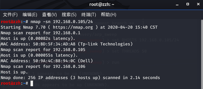 原理:nmap -sn 参数可以用来探测某网段的活跃主机
