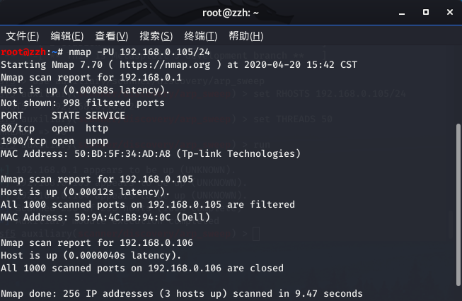 原理:nmap -PU参数是对UDP端口进行探测,与udp_sweep模块功能相同。