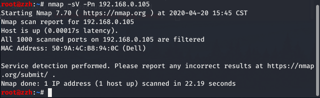 nmap -sV -Pn 192.168.0.105,其中 -Pn 是在扫描之前,不发送 ICMP echo 请求测试目标