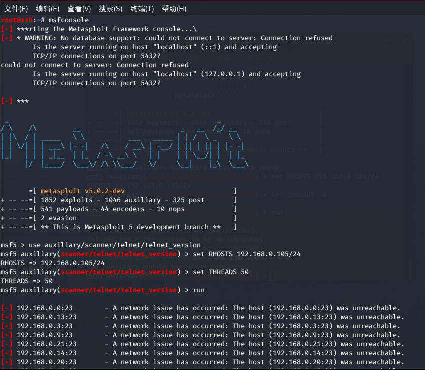 - set RHOSTS 192.168.0.105/24 //用set进行hosts主机段设置