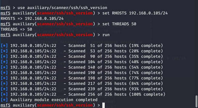 - set RHOSTS 192.168.0.105/24 //扫描网段