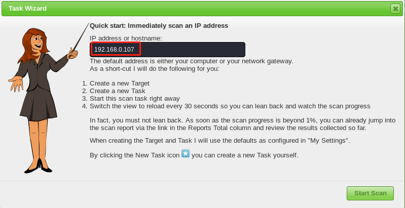 Tasks,进入后点击Task Wizard新建一个任务向导,在栏里输入192.168.0.107,点击Start Scans确认,开始扫描: