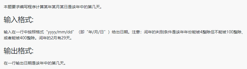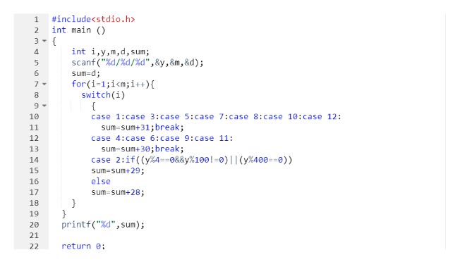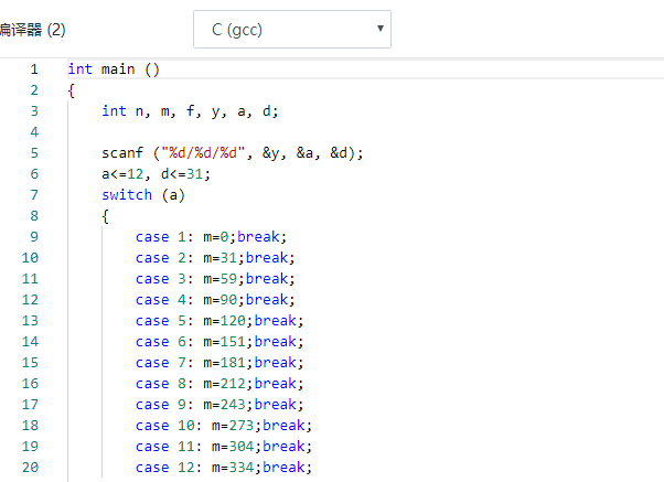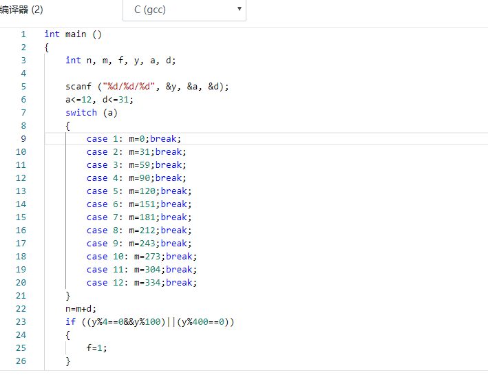 - 数据处理:该题用if-else语句和switch语句,首先用switch语句算出每个月后的累加天数,再用if-else进一步运算出闰年与非闰年,二月前与二月后差别。