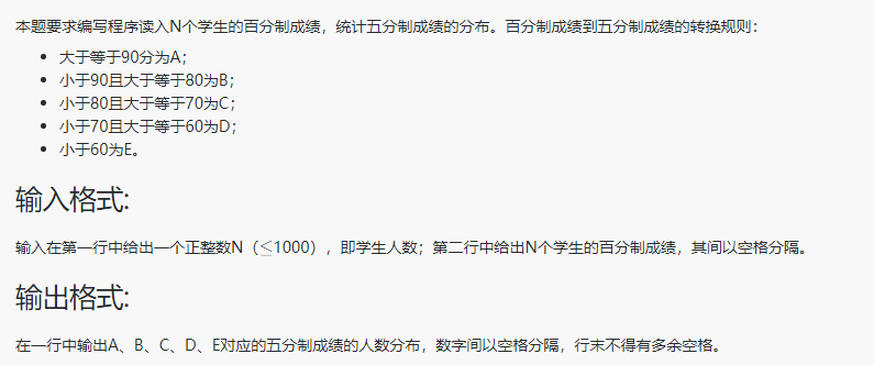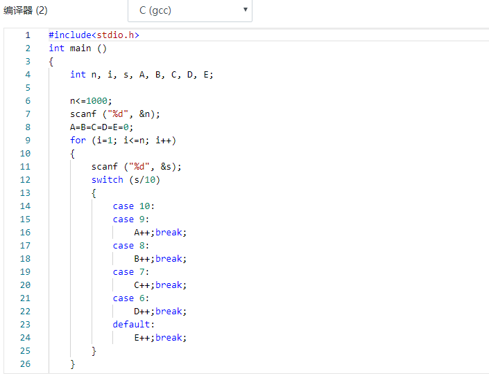 - 数据处理:运用了for语句与switch语句,首先输入n个学生的成绩,用for语句循环,在经过switch语句累加不同等级的人数。