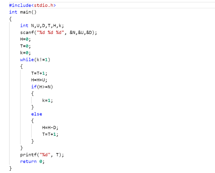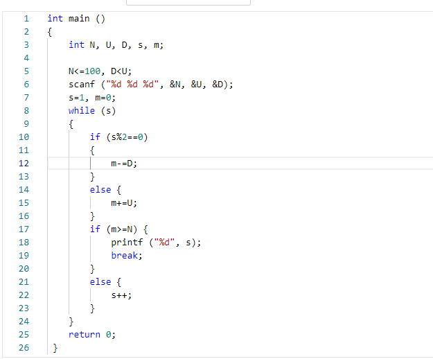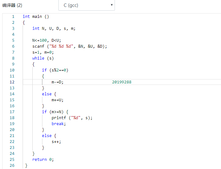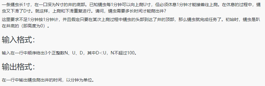 - 数据表达:定义了N,U,D,s, m等整型变量,N指井的高度,U指一分钟爬的高度,D指一分钟滑下的长度。