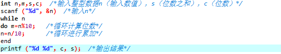 - 数据表达:定义了n,m,s,c等整型变量,n为输入的数据,s指各位数之和,c代指位数。
