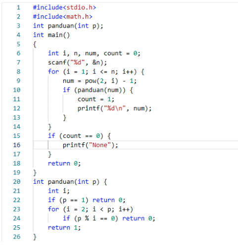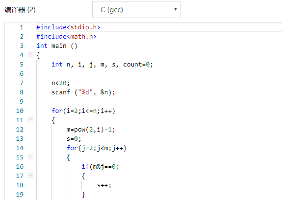 用的都是整型变量,n指输入的整数,i,j用于for循环,m代指梅森数,s和count都用于累加,判断有无。 - 数据处理: