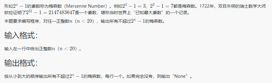 |16 | 3 7 31 127 8191 | 不超过2^16-1的梅森数 |