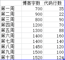 - |周/日期|这周所花的时间|代码行|学到的知识点简介|目前比较迷惑的问题|