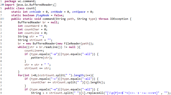 主函数思路:通过输入的命令来判断执行各个功能函数,将输入的命令分割为两部分,第一部分是指令,第二部分是文件路径,把两者同时传到count文件,用指令来判断需要执行的方法,文件路径作为参数。