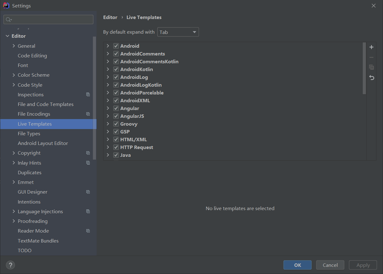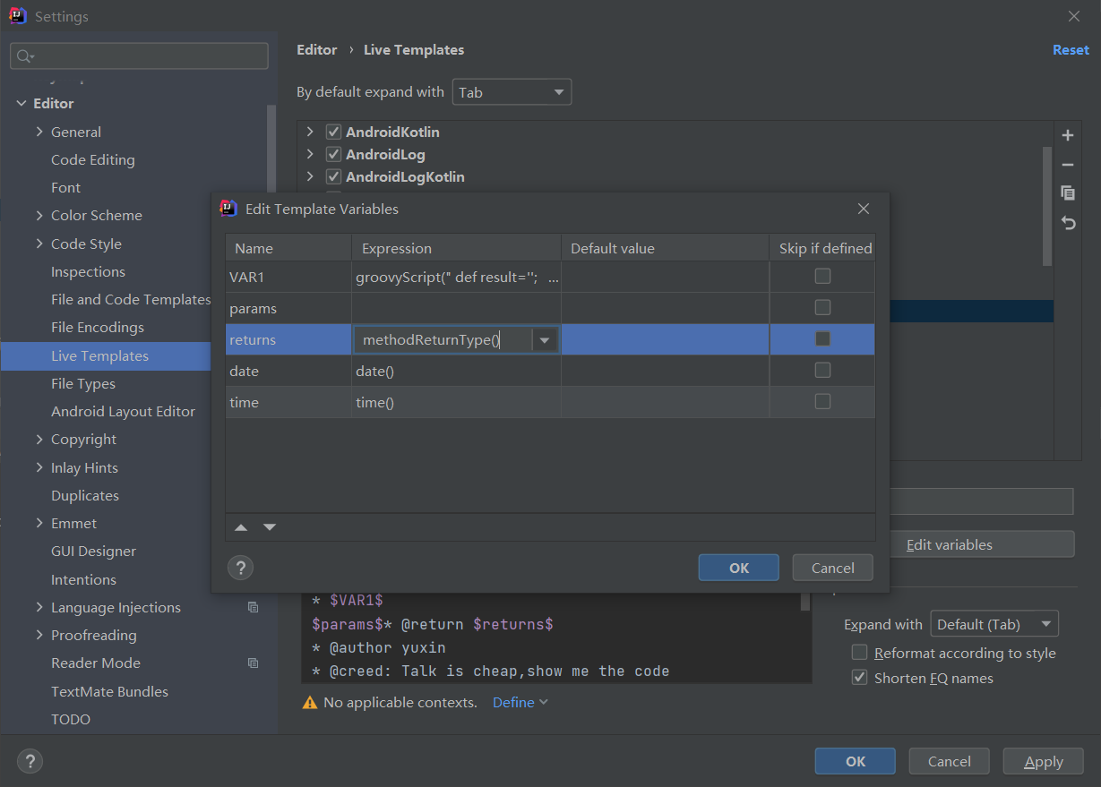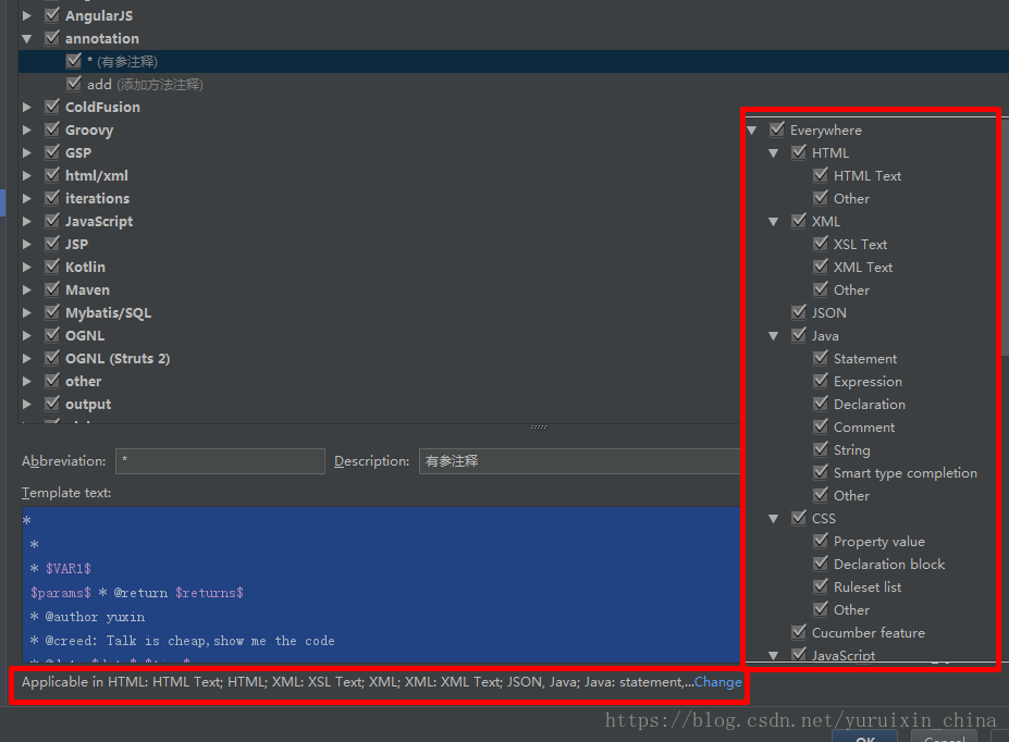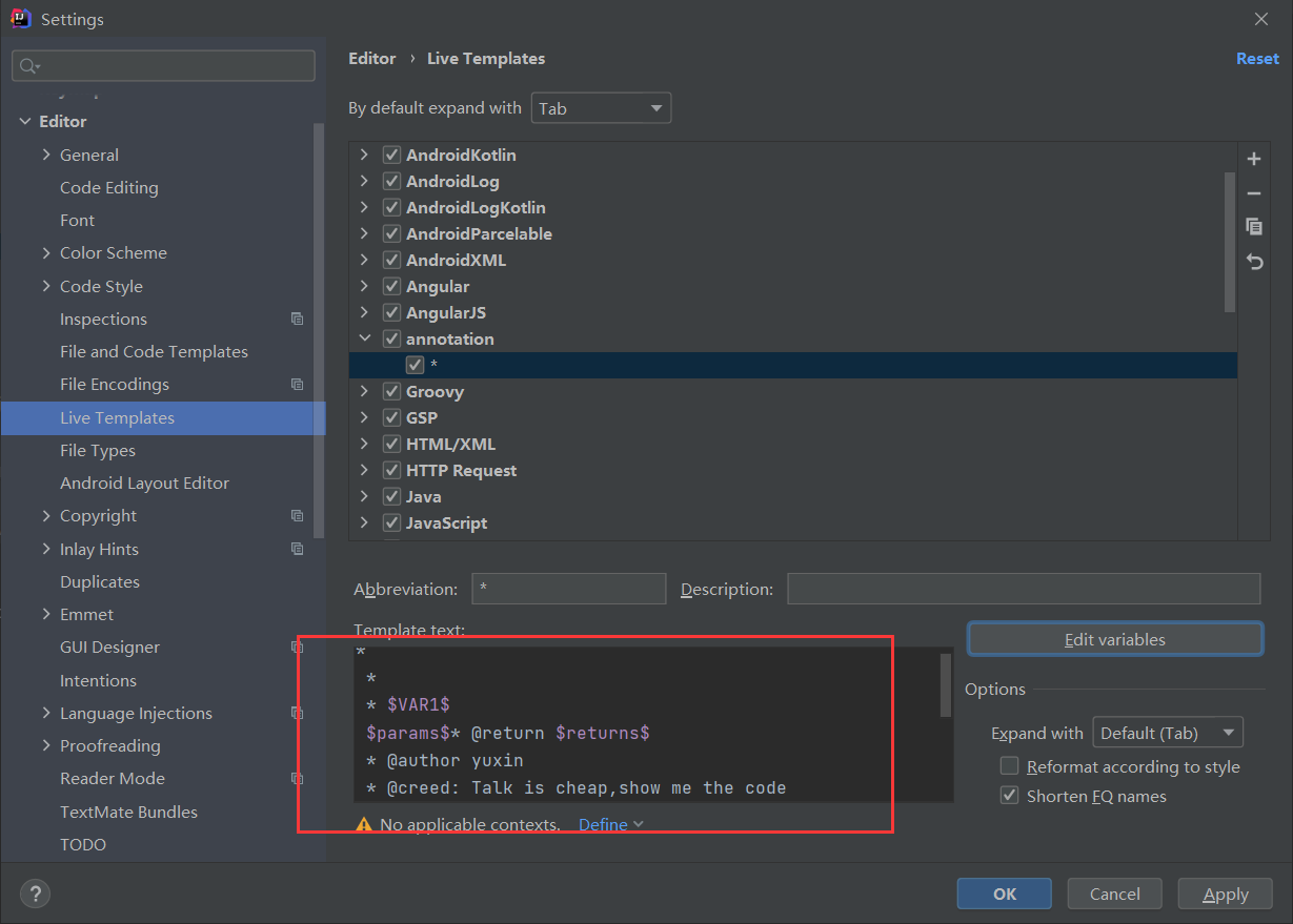 然后,选中刚才创建的annotation,然后再次点击右侧的绿色+,这次选择的是第一个1. Live Template。取名为*。-