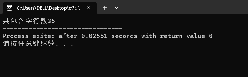 #include <stdio.h> #include <stdlib.h> int main() { FILE *fp; int i=0; char ch; fp=fopen("data4.txt","r"); if(fp==NULL) { printf("fail to open file\n"); return 1; } while(!feof(fp)) {ch=fgetc(fp); if(ch>33) i++; } fclose(fp); printf("共包含字符数%d",i); return 0; }