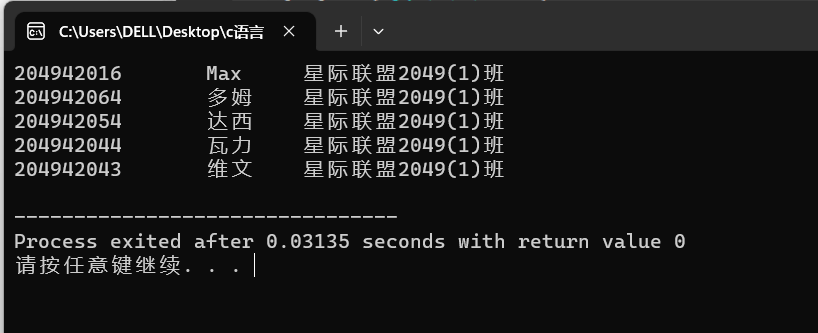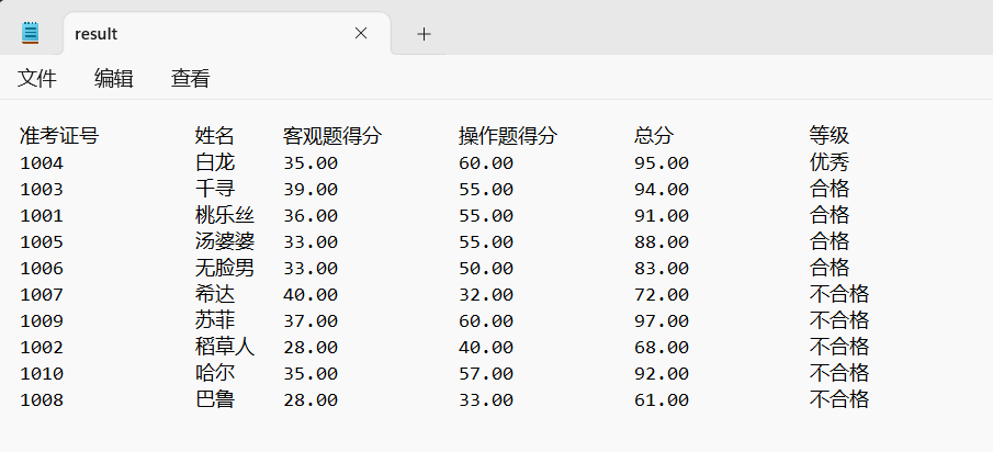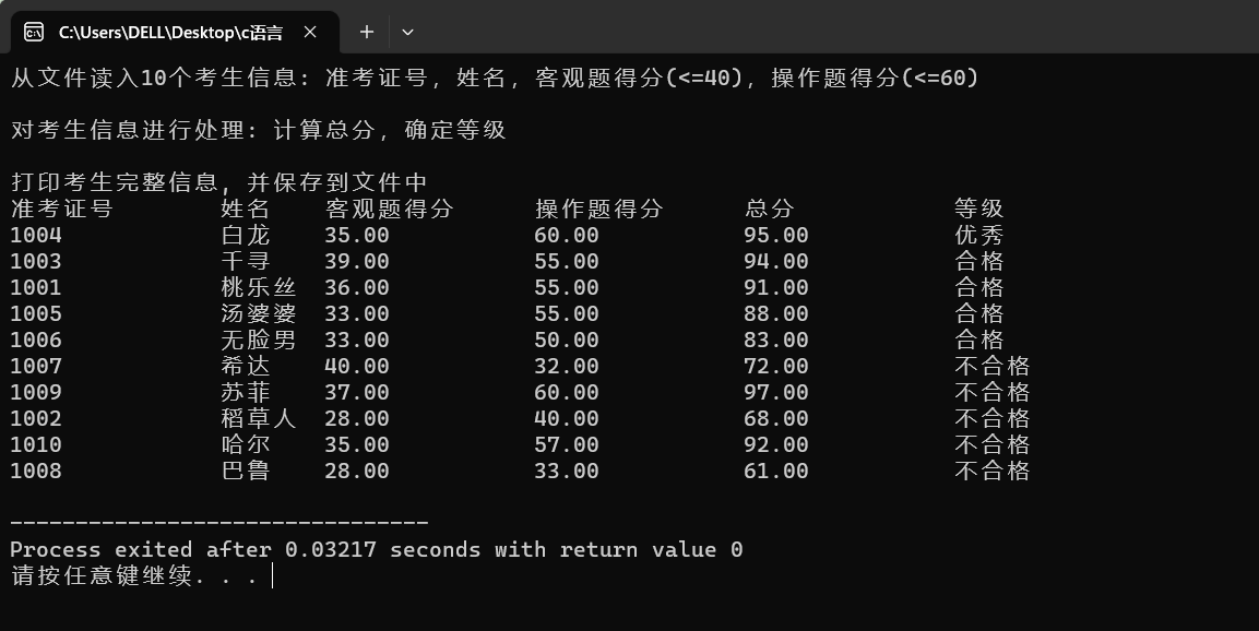 #include <stdio.h> #include <string.h> #include <stdlib.h> #define N 10 typedef struct { long int id; char name[20]; float objective; // 客观题得分 float subjective; // 操作题得分 float sum; char level[10]; } STU; // 函数声明 void input(STU s[], int n); void output(STU s[], int n); void process(STU s[], int n); int main() { STU stu[N]; printf("从文件读入%d个考生信息: 准考证号,姓名,客观题得分(<=40),操作题得分(<=60)\n", N); input(stu, N); printf("\n对考生信息进行处理: 计算总分,确定等级\n"); process(stu, N); printf("\n打印考生完整信息, 并保存到文件中"); output(stu, N); return 0; } // 从文本文件examinee.txt读入考生信息:准考证号,姓名,客观题得分,操作题得分 void input(STU s[], int n) { int i; FILE *fin; fin = fopen("examinee.txt", "r"); if (fin == NULL) { printf("fail to open file\n"); exit(0); } while (!feof(fin)) { for (i = 0; i < n; i++) fscanf(fin, "%ld %s %f %f", &s[i].id, s[i].name, &s[i].objective, &s[i].subjective); } fclose(fin); } // 输出考生完整信息: 准考证号,姓名,客观题得分,操作题得分,总分,等级 // 不仅输出到屏幕上,还写到文本文件result.txt中 void output(STU s[], int n) { FILE *fout; int i; // 输出到屏幕 printf("\n"); printf("准考证号\t姓名\t客观题得分\t操作题得分\t总分\t\t等级\n"); for (i = 0; i < n; i++) printf("%ld\t\t%s\t%.2f\t\t%.2f\t\t%.2f\t\t%s\n", s[i].id, s[i].name, s[i].objective, s[i].subjective, s[i].sum, s[i].level); // 保存到文件 fout = fopen("result.txt", "w"); if (!fout) { printf("fail to open or create result.txt\n"); exit(0); } fprintf(fout, "准考证号\t\t姓名\t客观题得分\t操作题得分\t总分\t\t等级\n"); for (i = 0; i < n; i++) fprintf(fout, "%ld\t\t%s\t%.2f\t\t%.2f\t\t%.2f\t\t%s\n", s[i].id, s[i].name, s[i].objective, s[i].subjective, s[i].sum, s[i].level); fclose(fout); } // 对考生信息进行处理:计算总分,排序,确定等级 void process(STU s[], int n) { int i,j; STU t; for(i=0;i<n;i++){ s[i].sum=s[i].objective+s[i].subjective; for(j=1;j<n;j++){ if(s[j-1].sum<s[j].sum){ t=s[j]; s[j]=s[j-1]; s[j-1]=t; } } } for(i=0;i<n*0.1;i++) strcpy(s[i].level,"优秀"); for (;i<n*0.5;i++) strcpy(s[i].level,"合格"); for(i;i<n;i++) strcpy(s[i].level,"不合格"); }