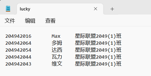 #include <stdio.h> #include <time.h> #include <stdlib.h> #define N 100 int main() { FILE *fp; int i,j,k,flag[5]; char s[N][N]; fp=fopen("list.txt","r"); for(i=0;i<80;i++) fgets(s[i],80,fp); fclose(fp); srand(time(NULL)); fp=fopen("lucky.txt","w"); for(i=0;i<5;i++) { k=rand()%(80+i);flag[i]=k; for(j=0;j<i;j++) {if(flag[i]==flag[j])i--; } } for(i=0;i<5;i++) { printf("%s",s[flag[i]]); fprintf(fp,"%s",s[flag[i]]); } fclose(fp); return 0; }