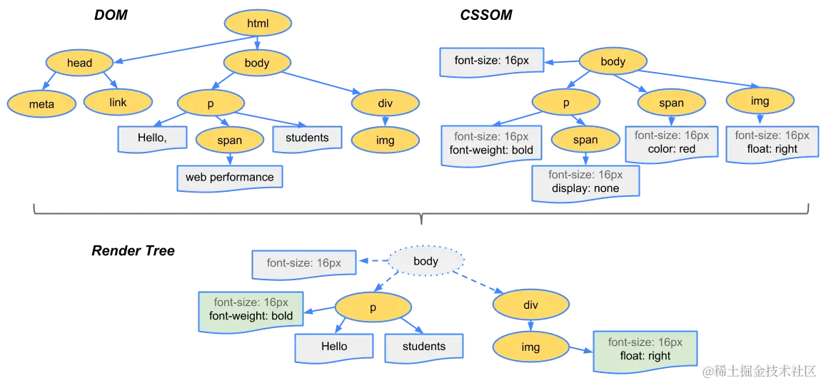 浏览器将 DOM 和 CSSOM 结合,创建渲染树,包含可见元素及其样式。