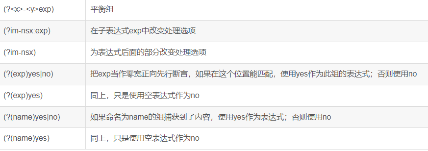 | (?<name>exp) | 匹配exp,并捕获文本到名称为name的组里,也可以写成(?'name'exp) | |