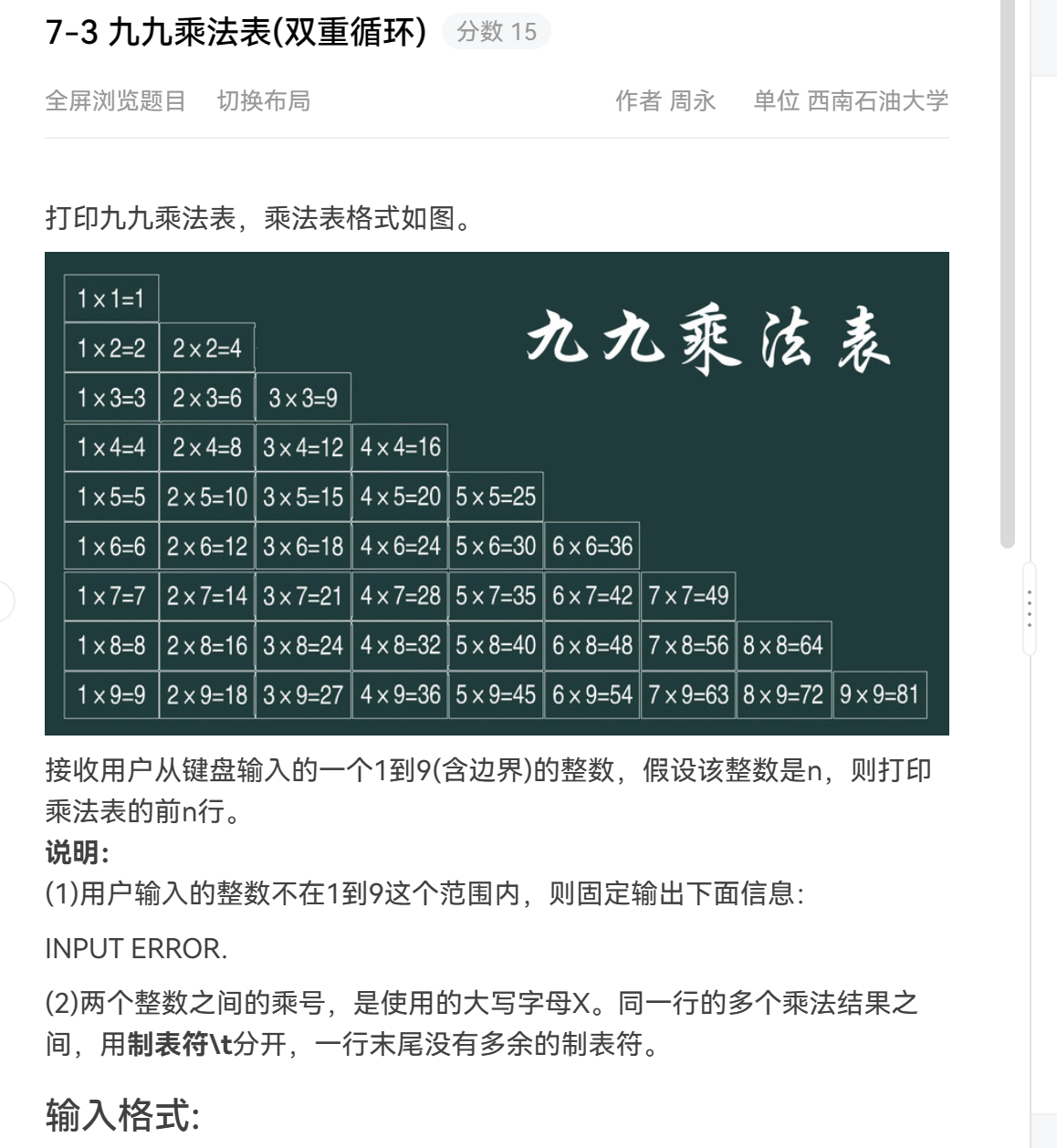 心得:简单的二重for循环,非法输入时特定输出,注意口诀表的格式(空格,乘法的格式)