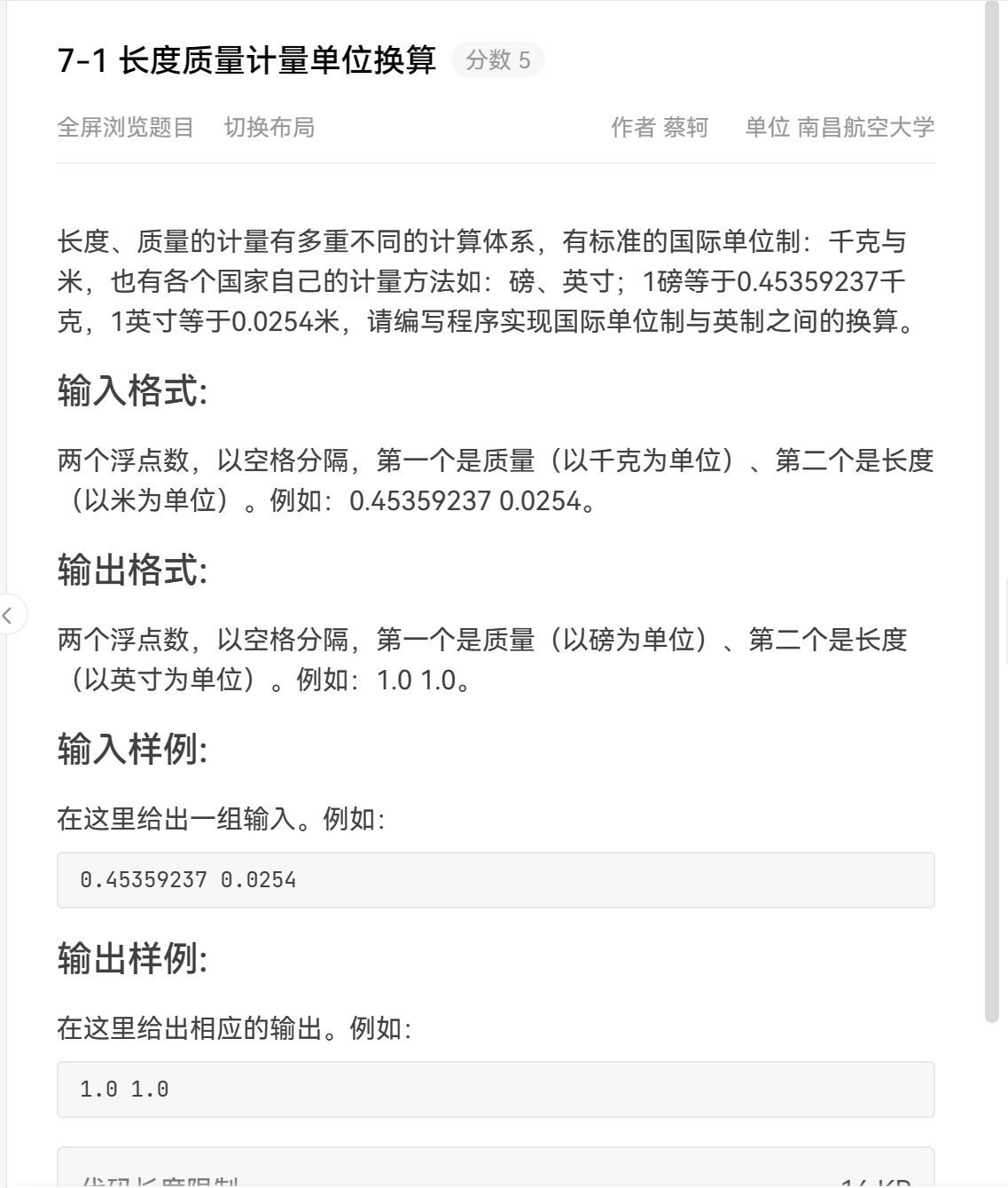 7-1 长度质量计量单位换算,输入的数是double型,而输出需要变为float型;