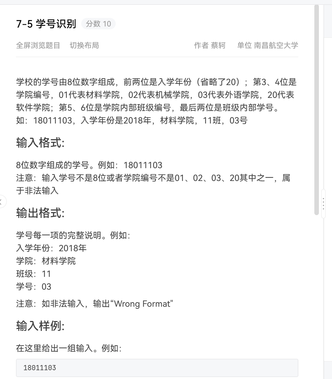 7-5 学号识别,开始写程序时我是用字符数组储存学号,但无法输出结果,所以又将号码转换成ASCLL,但由于无法调用字符数组中相邻整数型字符,最后还是用字符串与equals函数解决问题;
