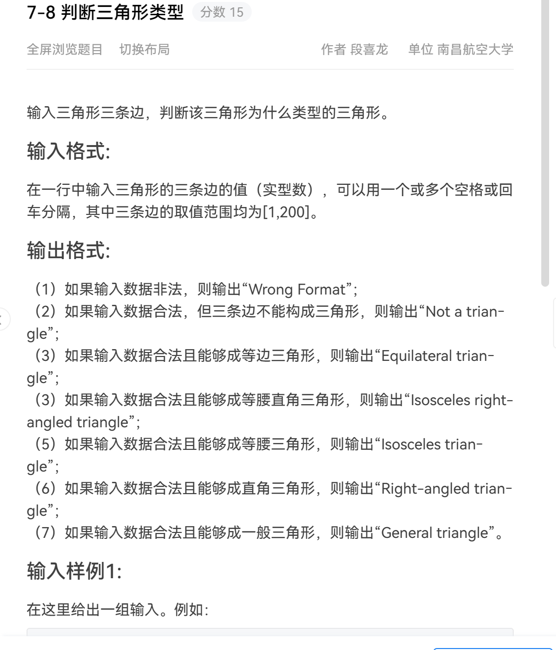 7-8 判断三角形类型:在实现判断条件的包含关系没有想全面
