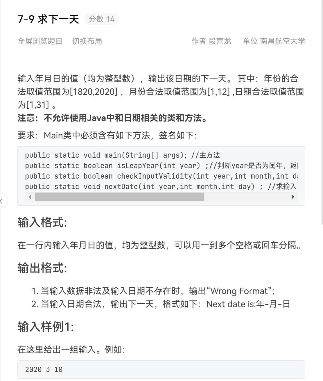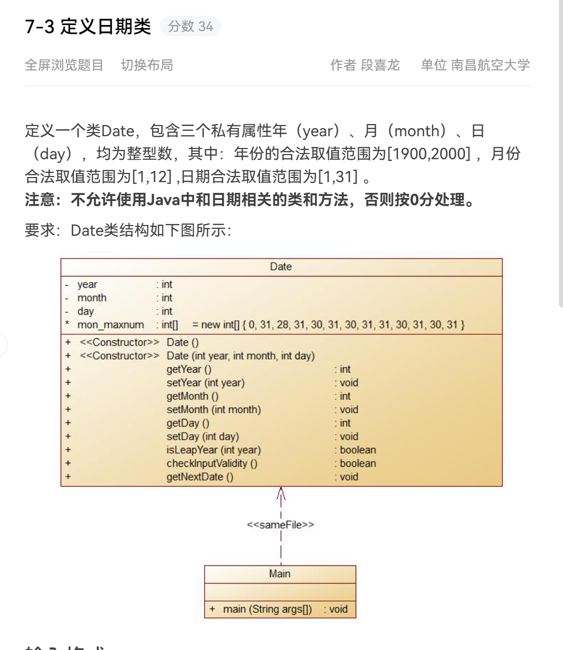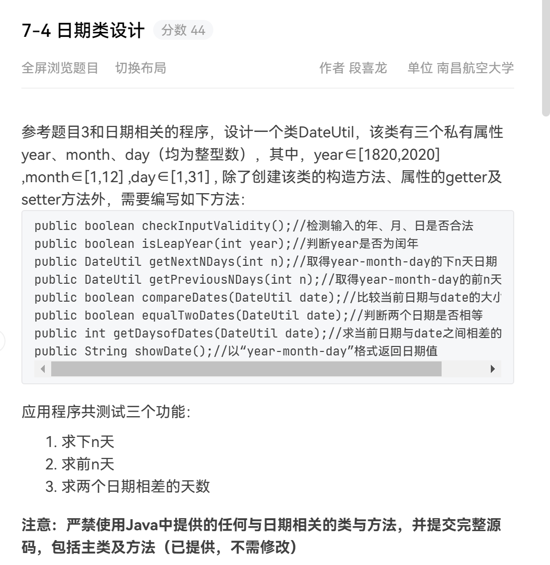 7-4日期类设计:求下n天与上n天时并不是用for循环一天天递增的,而是看n的范围,首先判断是否超过此月,再判断是否超过此年,再判断超过此年多少天。但发现诸多问题,尤其是n很大时无法判断平年闰年,更无法判断二月多少天,所以逻辑行不通;