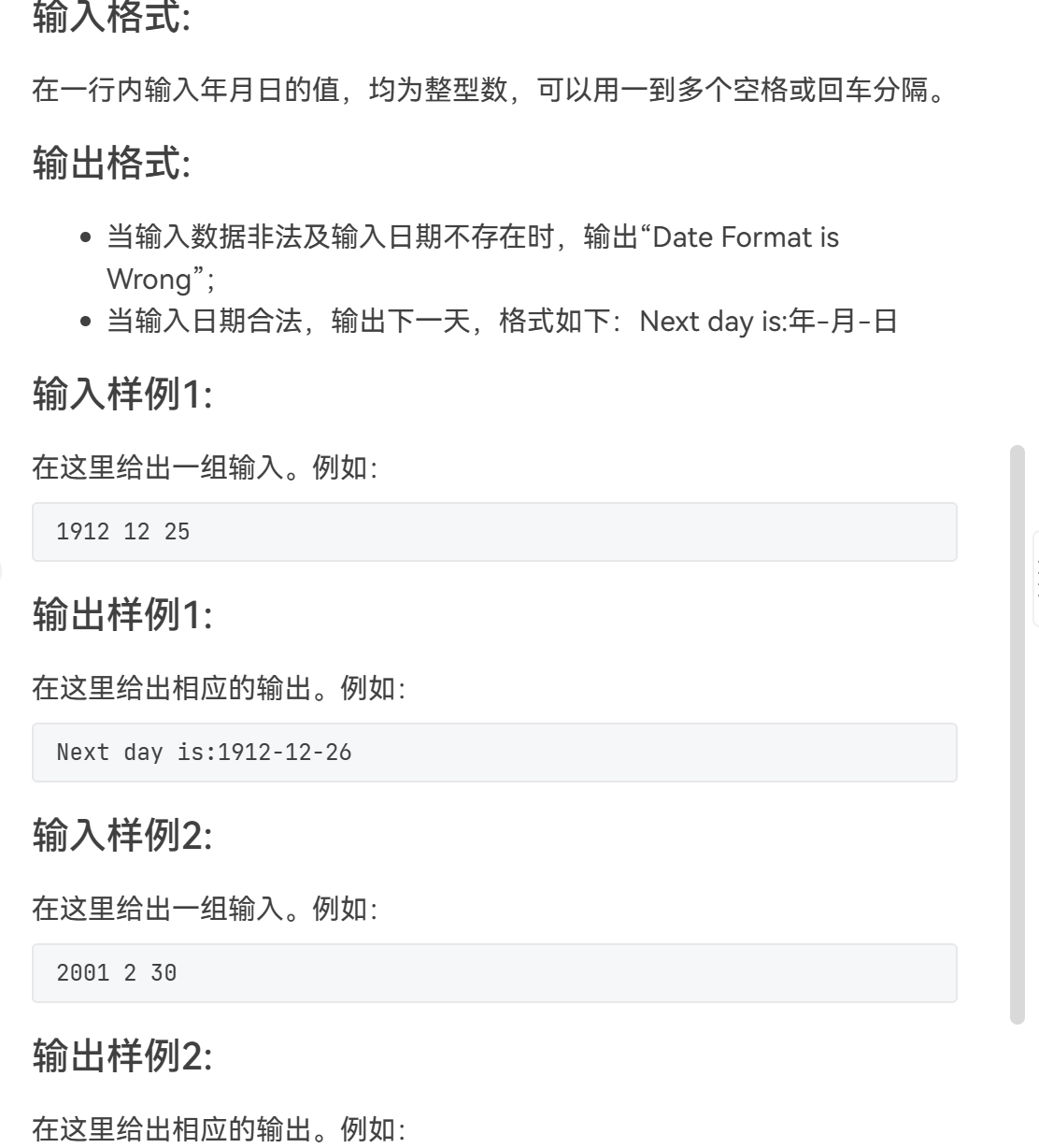 构建求下n天的方法,为了实现此功能,1.判断年,月,日是否合法,若输入合法,我们可以用for循环一天一天的增加,每一天包含一个判断的if语句,判断是否下一天跨了月份或者跨了年份,若未跨月和跨年,则直接 day++;输出年月日即可。若跨月,则month++;day =1;再输出年月日即可。若跨年,则year ++;month =1;day =1;再输出年月日即可。此时跨月与跨年的过程中分为是否闰年是否2月与是否大月。