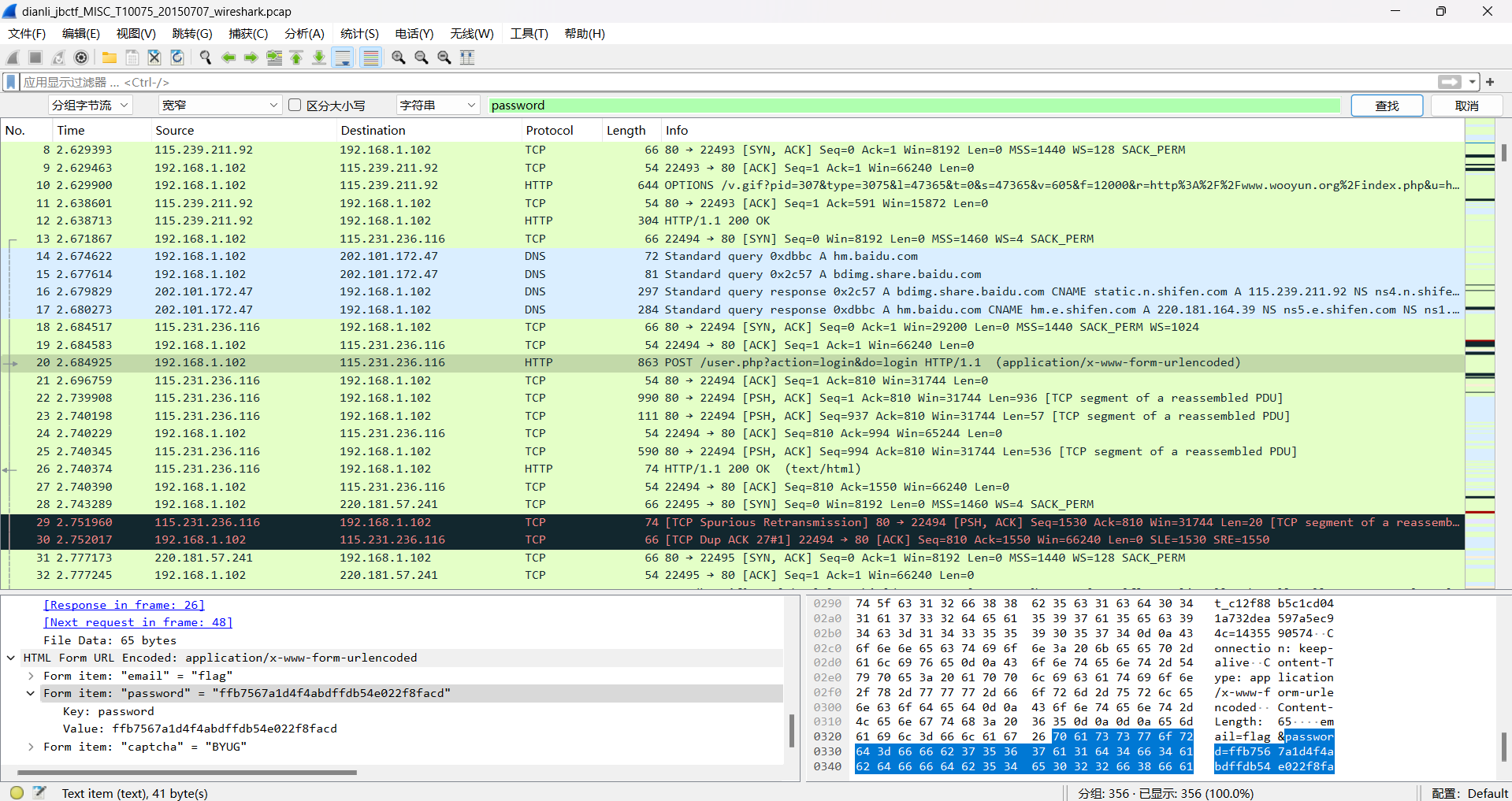 搜索分组列表选择‘分组字节流’,查找字符串 passwd、password、flag、admin等相关词汇