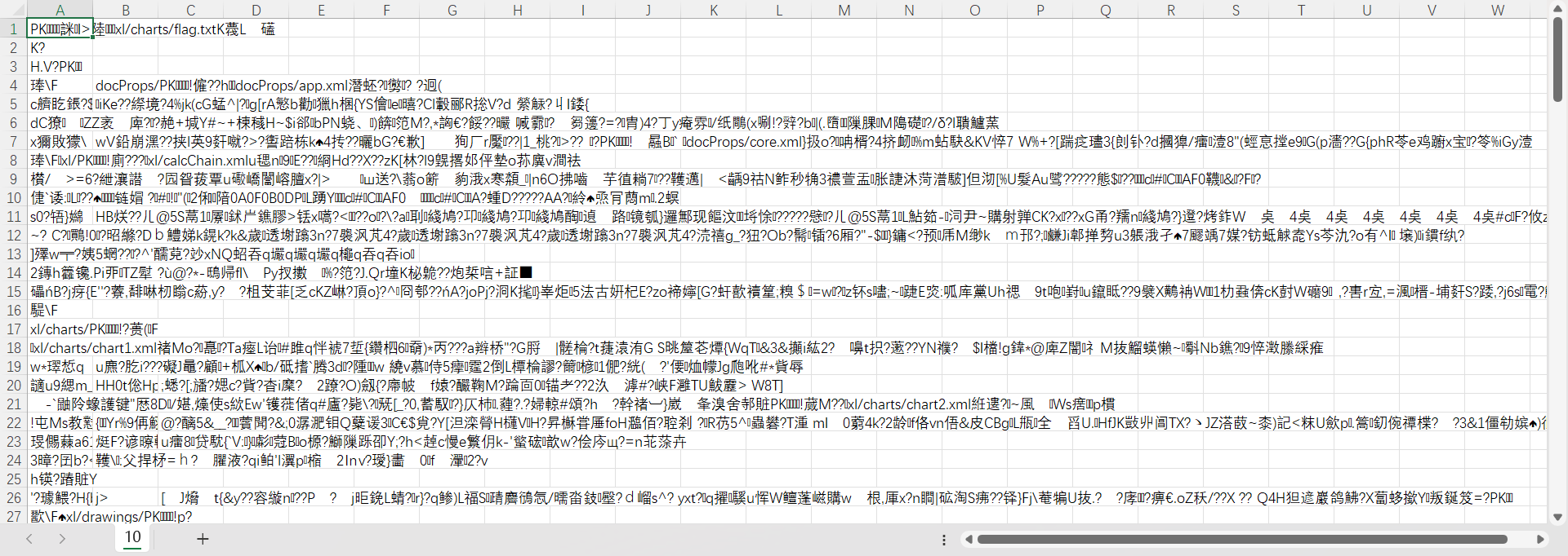 出现乱码,但可以发现第一行 xl/charts/flag.txt 标注了flag的位置