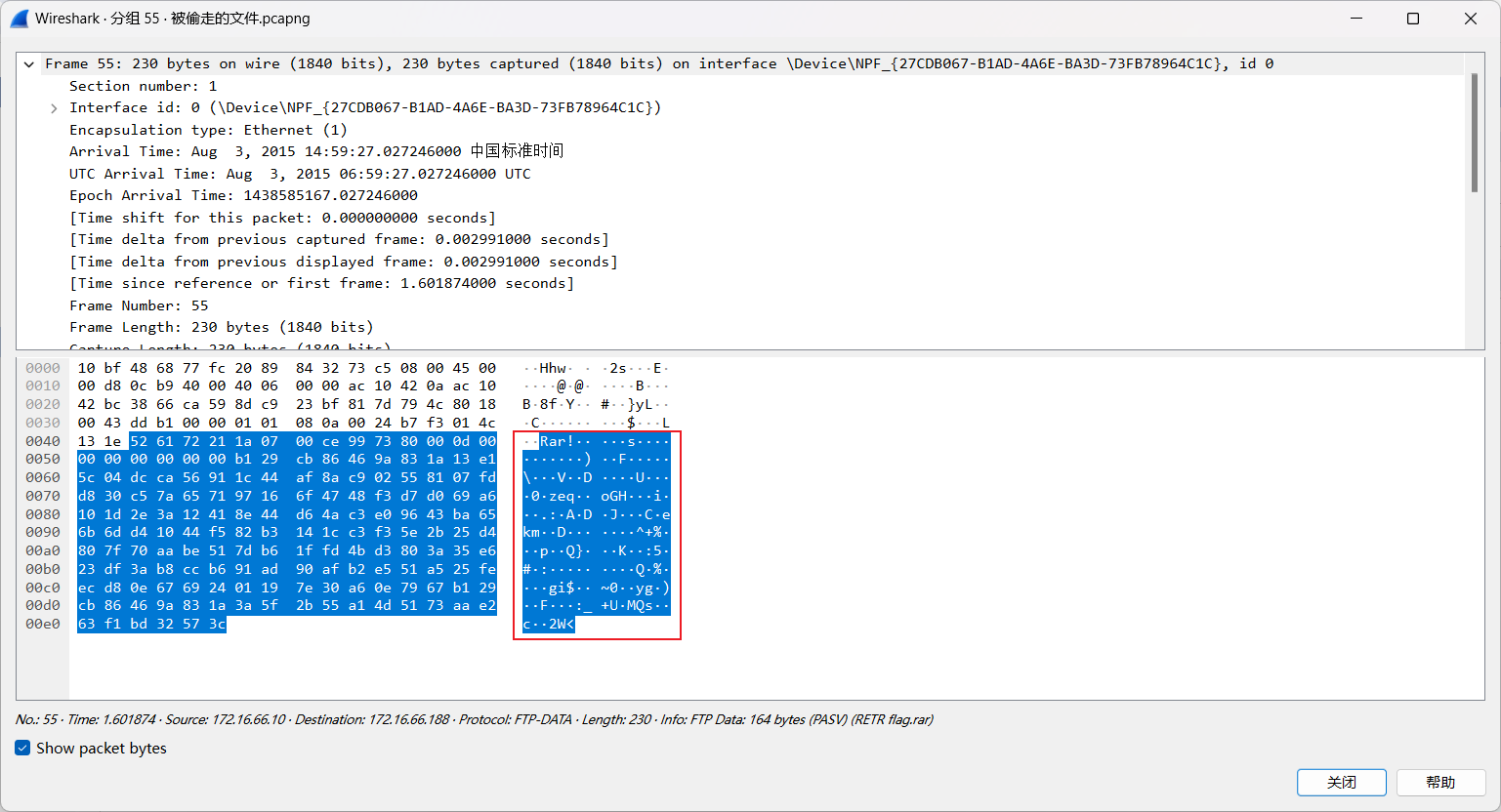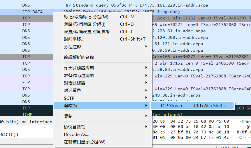 发现一个请求flag.rar的请求,往下找发现一个FTP data,怀疑是这个包泄露了关键信息,即flag.rar