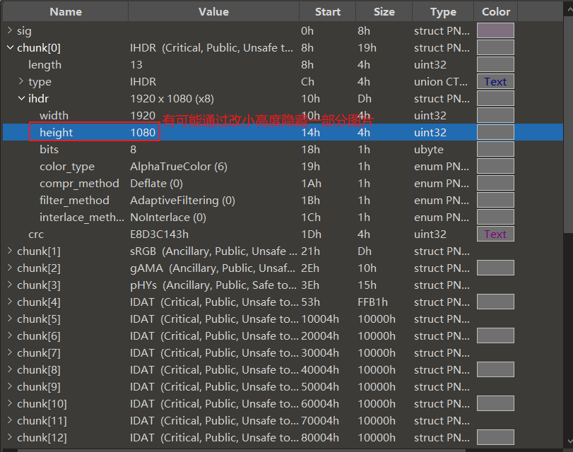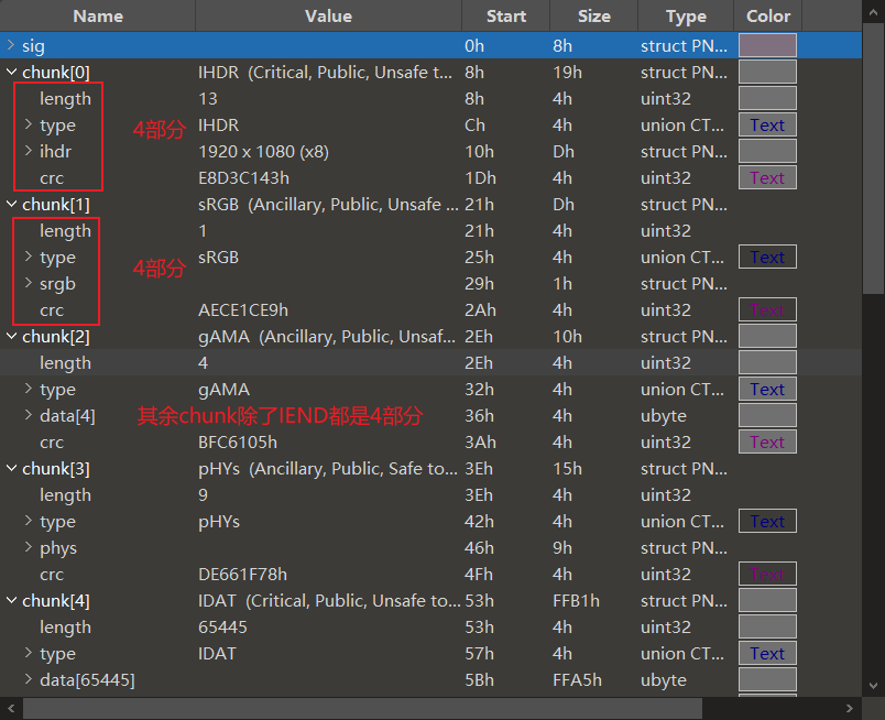 IHDR和其他块一样,有长度部分、类型部分即IHDR、数据部分以及CRC部分