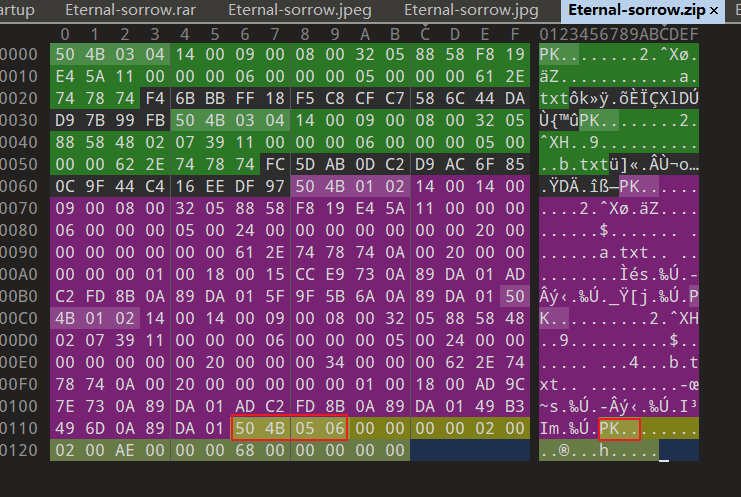 zip文件尾存在中央目录区,每个条目以 50 4B 01 02开头