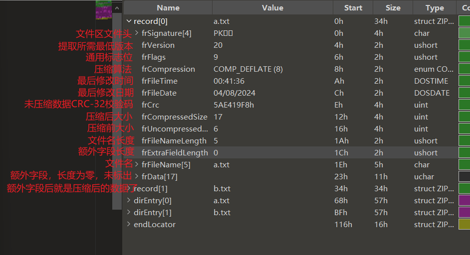 这个压缩包额外字段长度为零,所以没有额外字段区,直接就到了压缩后数据区