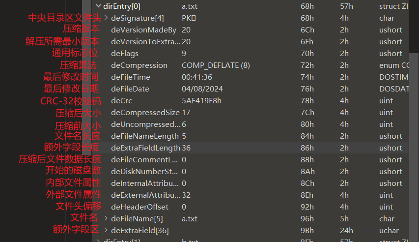 每个中央目录区条目对应着文件区的一个文件或目录,中央目录存放着偏移量,可以用来寻找对应的文件区文件
