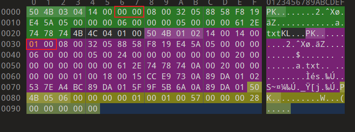 中央目录区通用标志位的1可更改为任意奇数,即可实现伪加密,改回偶数即可去除伪加密