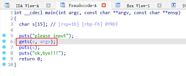 发现高危函数gets,这个函数不会检查输入的长度,直到用户输入换行符为止