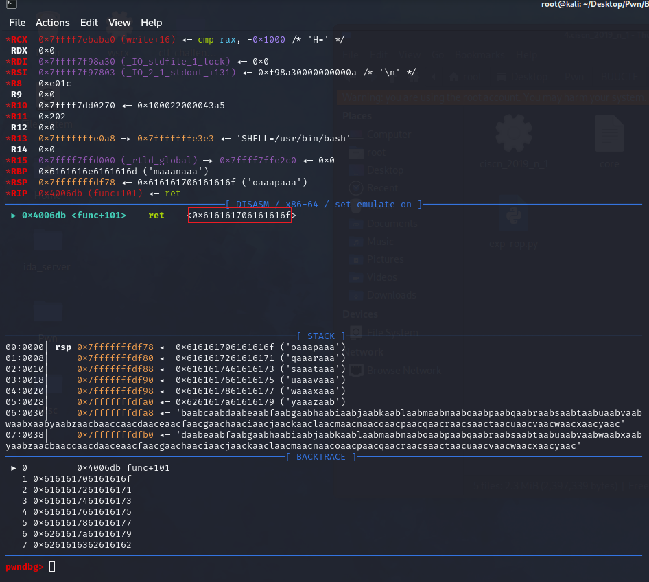 程序没有开启PIE,可以直接覆盖返回地址,下面介绍一个快速计算溢出长度的方法