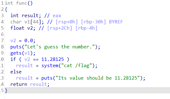 也就是说我们可以先输入44个填充数据,再输入11.28125在内存中的表示,就可以修改v2的值了