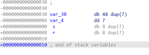 我们可以看到,v1数组占44个字节,v2浮点数占4个字节,44+4=48=0x30