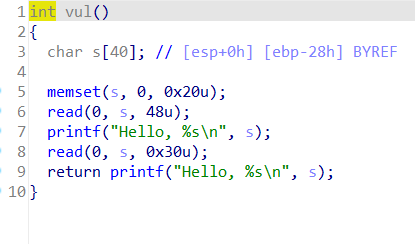 我们看到在vul函数中,有两个read函数,每个都读取了0x30(48)大小的字符,并放入字符数组s中,也就是说我们能溢出的只有8个字节,刚好覆盖到ebp和返回地址