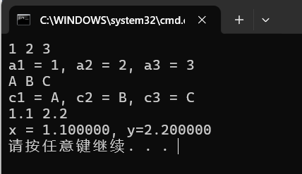 printf("c1 = %c, c2 = %c, c3 = %c\n", c1, c2, c3);
