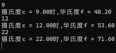 F=32+9.0/5.0*C; //此处不能写成9/5,其取整为1,需修改为浮点数除法//