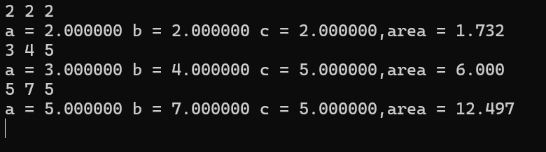 printf("a = %lf b = %lf c = %lf,area = %.3lf\n", a,b,c,s);}