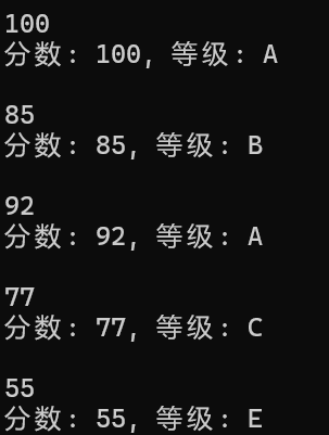 printf("分数: %d, 等级: %c\n\n", score, grade);