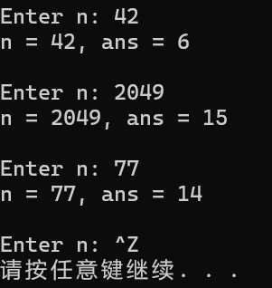 printf("n = %d, ans = %d\n\n", n, ans);