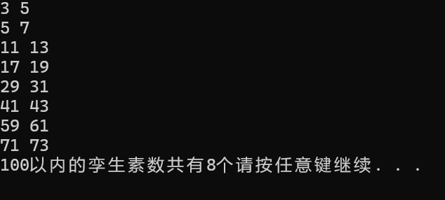 printf("100以内的孪生素数共有%d个",s);