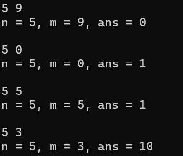 printf("n = %d, m = %d, ans = %d\n\n", n, m, ans);