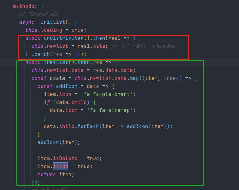 methods: { // 初始化树列表 async initList() { this.loading = true; await undistributed().then(res1 => { this.newlist = res1.data; // 第二个接口 返回的数据 }).catch(res => {}); await treeList().then(res => { this.newlist.data = res.data.data; const cdata = this.newlist.data.map((item, index) => { const addIcon = data => { item.icon = 'fa fa-pie-chart'; if (data.child) { data.icon = 'fa fa-sitemap'; } data.child.forEach(item => addIcon(item)); }; addIcon(item); item.isDelete = true; item.isAdd = true; return item; }); }