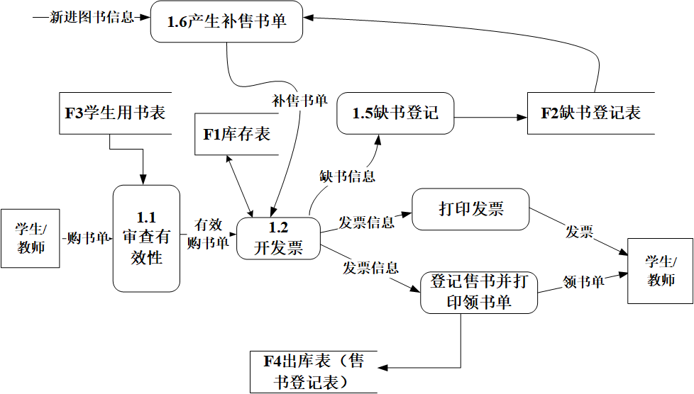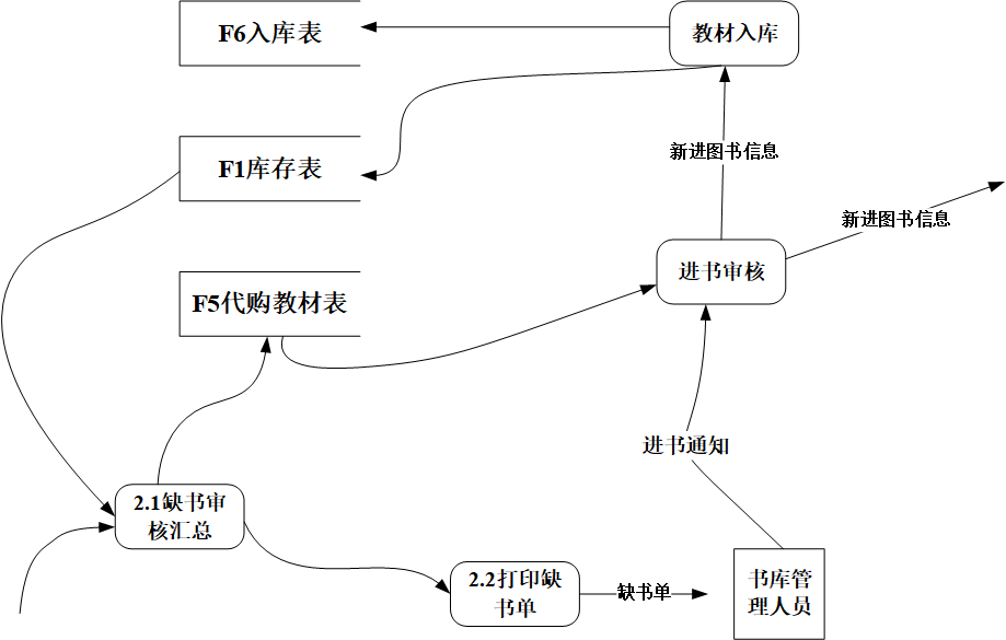 采购系统的主要工作过程为:若是脱销教材,则登记缺书,发缺书单给书库采购人员;一旦新书入库后,即发进书单通知给教材发