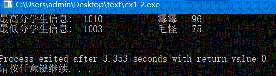 // 从文本文件file1.dat中读取数据,找出最高分和最低分学生信息,并输出在屏幕上 #include <stdio.h> #include <stdlib.h> #define N 10Part1: 验证性实验 // 定义一个结构体类型STU typedef struct student { int num; char name[20]; int score; }STU; int main() { STU st, stmax, stmin; int i; FILE *fp; // 以只读文本方式打开文件file1.dat fp = fopen("file1.dat", "r"); if( !fp ) { // 如果打开失败,则输出错误提示信息,然后退出程序 printf("fail to open file1.dat\n"); exit(0); } stmax.score = 0; // 先假定最高分是0,后面如发现比当前最高分还高的分数,就更新最高分 stmin.score = 100; // 先假定最低分是100分,后面如发现比当前最低分更低的分数,就更新最低分 for(i=0; i<N; i++) { fscanf(fp, "%d %s %d", &st.num, st.name, &st.score); // 从fp指定的文件中格式化读取一个学生信息 if(st.score > stmax.score) stmax = st; else if(st.score < stmin.score) stmin = st; } fclose(fp); printf("最高分学生信息: %5d%15s%5d\n", stmax.num, stmax.name, stmax.score); printf("最低分学生信息: %5d%15s%5d\n", stmin.num, stmin.name, stmin.score); return 0; } // 这是《C语言程序设计教程学习指导》「2.10 文件」中的实验,细微处做了微调 // 这个源代码没有考虑多个高分或多个低分的情形。