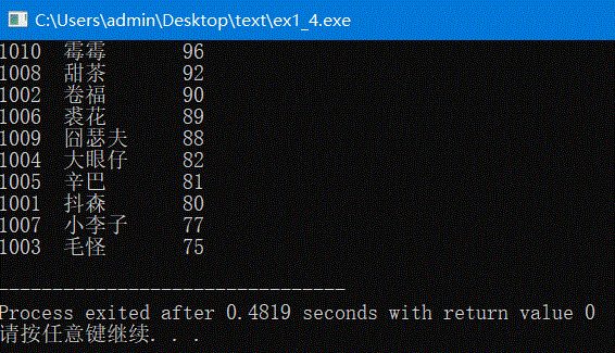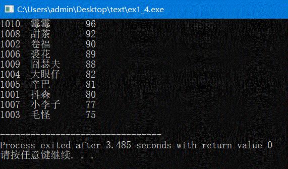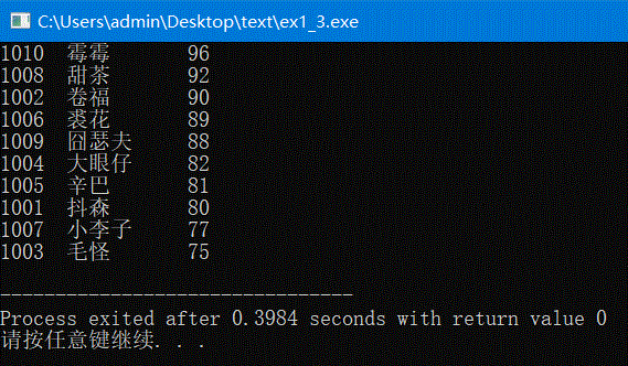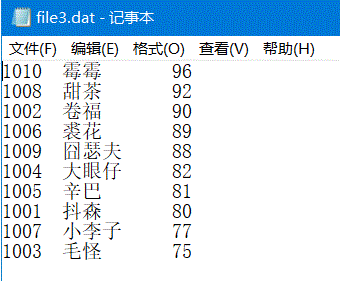 运行程序,屏幕上正确输出了按分数高到底排序的信息,同时,在当前路径下,生成了文本文 件file3.dat,用记事本程序打开文件file3.dat,里面的数据信息是正确的,并且是直观可读的。